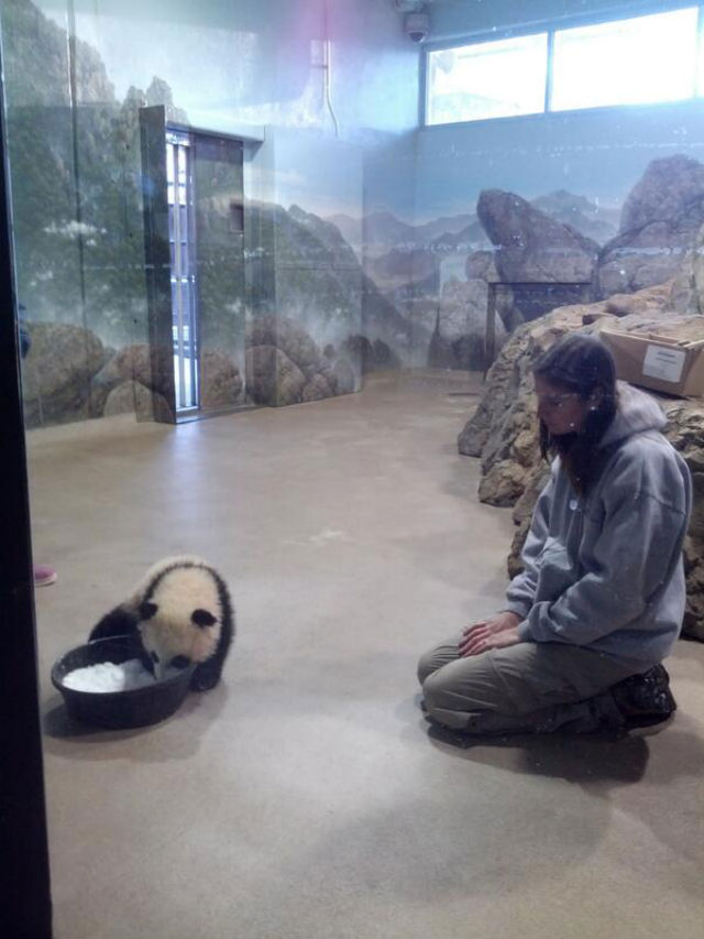 From the Zoo: “Bao Bao isn’t quite ready to go outside, so keepers brought snow to her this morning!”