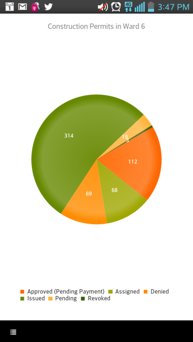 The Public Space Permit Viewer app — available for Android, iPhone and Windows 8 users — can pull up recent construction and occupancy (funerals, parades, etc.) permits in the city. You can also create bar and pie charts to show how many permits have been approved, issued, rejected and revoked. (The time period used for these charts aren’t clear, and we’re waiting to hear back from DDOT.)