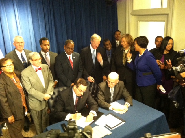 Joined by a majority of the members of the D.C. Council, Mayor Gray, along with Council Chairman Phil Mendelson signed a bill that will increase the District’s minimum wage to $11.50 by 2016.