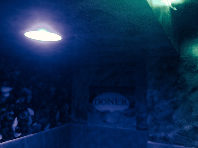 +4 for truly outstanding background music: Aside from the occasional groan or splash, I generally prefer my bathrooms to be a silent experience. God forbid anyone actually speaks while relieving themselves. Doner Bistro instead takes things in the opposite direction: while German radio pervades the dining area, there is a soundtrack of New Age aquarium music in the bathroom. This bathroom-going soundtrack is unquestionably terrific: the music alienates and provides comfort. It gives an otherworldly experience, as if the bathroom is an oasis from your drunk asshole friends. The bathroom is home.