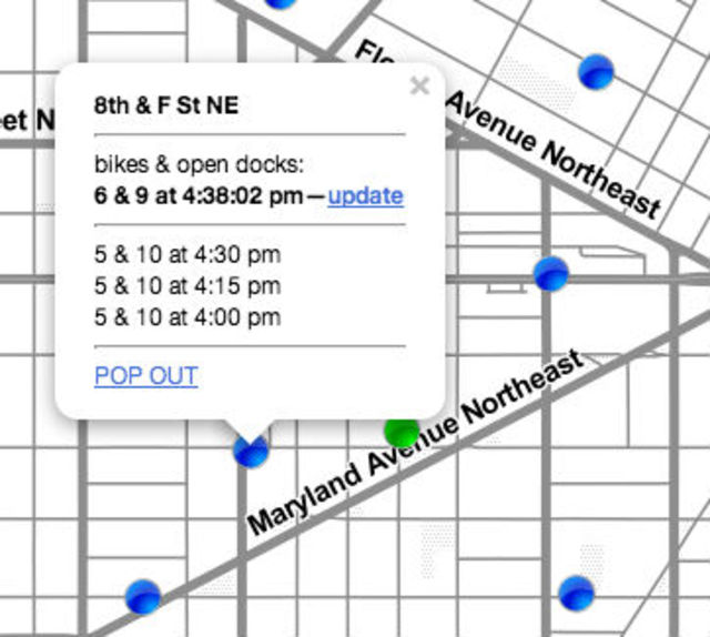 BIKESHARE IQ is similar to Spotcycle, but Rausnitz explains how it differs: “It tracks the trend for each station’s supply of bikes and open docks (so you can see how the supply is changing, not just the current state); it is a web app so you don’t have to download it (good for tourists and other short-term members); and offers a text-only option that loads quickly on phones.”