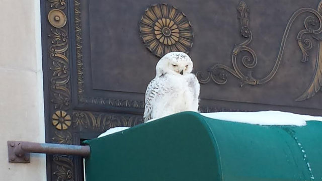 From reader Bryan McGannon come these photos of a Snowy Owl hanging out on an awning at 1500 K Street NW today. That’s right: A Hedwig in D.C.
