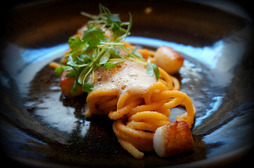 LINGUINE WITH KIMCHI AND UNI AT RANGE: (Ed. note: Range has since taken this off the menu, but hey, maybe this will inspire them to put it back on). Kimchi and pasta doesn’t seem like it should work at all, but somehow all the disparate flavors come together in this Italian-Asian mash-up from Bryan Voltaggio. The kimchi flavor is subtle, lending the faintest hint of spice and fermented funk to a light tomato sauce. Ribbons of uni (sea urchin) melt as you twirl the noodles, like foie gras of the sea. The result is unexpected enough to keep things interesting but familiar enough to crave it again and again. — Alicia Mazzara