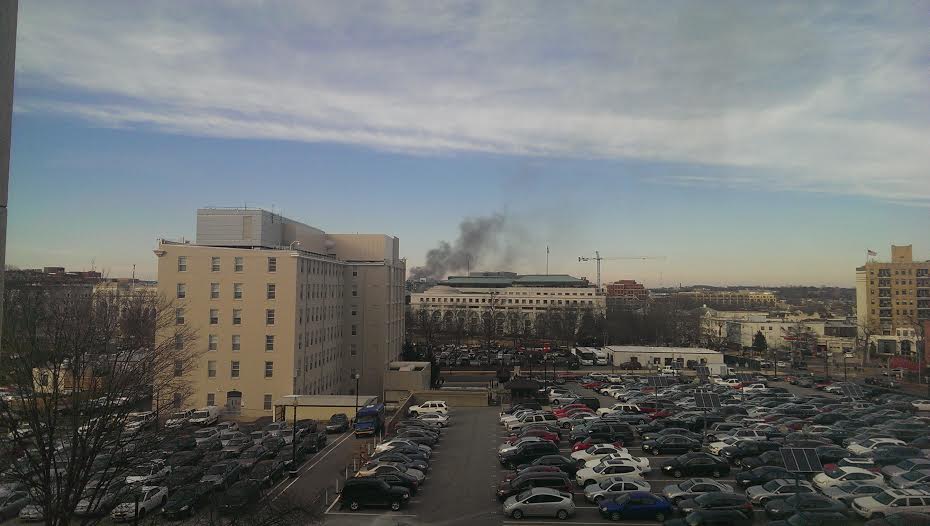 We’ll update this post as more details become available. A DCist reader sent in this picture of the fire from her office in the Hart Senate building.