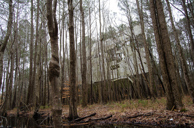 The drive-in’s massive screen is in shambles, but it still stands. It doesn’t seem out of place — far from it, actually. It is, after all, entirely made out of wood. The dozen or so massive, tar-covered telephone poles that support the screen are now covered in moss, while the plywood panels of the viewing surface itself are falling away one by one. Though grand in stature, the whole structure is nearly invisible until it’s right on top of you, only adding to the etherial quality of the place.