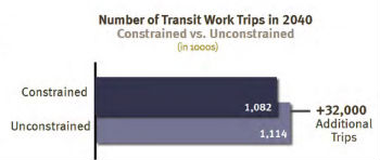 In other words, because regional leaders have not committed to funding transit, those that forecast travel demand have decided to stop forecasting increases in transit usage. Were it not for this artificial “cap”, travel demand forecasts would show much higher numbers of future transit use.