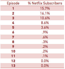 Bad news for haters of binge-watching: It’s happening. By 5:30 p.m. E.T., over 14 hours after HOC went online, 8.6 percent of these Netflix subscribers had watched episode four and 3.6 percent had watched episode five. A brave .1 percent reached episode 11 by that time.