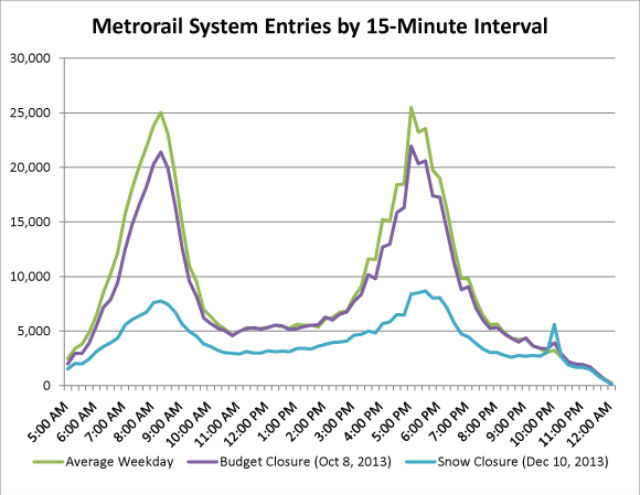 PlanItMetro crunched the numbers and a snow closure on December 10, 2013 came out on top. Big time. As the blog gathers, this is likely because snow affects everyone, while the shutdown mainly affected nonessential government employees.