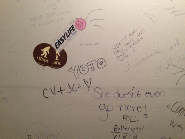 +6 for funny bathroom graffiti: First, a confession: my sense of humor can be really infantile. Few people see the scatological depths of what I find funny, except for maybe Matt, our beloved DCist editor. What delights me about the Ivy and Coney bathroom is how its vandals embrace infantile dick jokes. There are dick drawings on the wall, and there are stickers meant to look like dicks. Someone wrote, “Pee here,” and drew an arrow pointing to an electrical outlet. Coupled with a couple serious/not-serious arguments on the wall, this bathroom offers plenty of time to ogle while you’re relieving yourself.