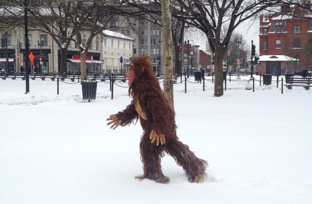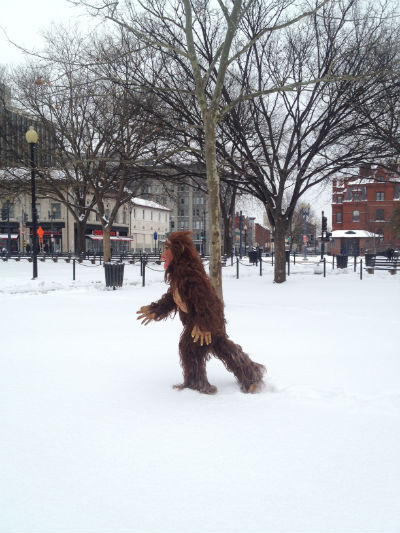 Photo by Jessica Ennis. What will hopefully be the final snow storm of this winter brought about five inches of the cold, wet stuff to the city, parking restrictions (as well as tickets and towing) and many closures. It also produced a Bigfoot, or rather a man in a Bigfoot suit, sighting.