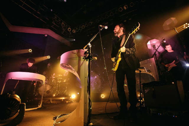 As everyone slowly found their spots in front of the elaborate stage setup, it was easy to tell that the crowd was excited for what they were about to see: Hands were pointing to the alien-like metal dishes protruding from the background, a giant screen projector, and three keyboards lined up and waiting.