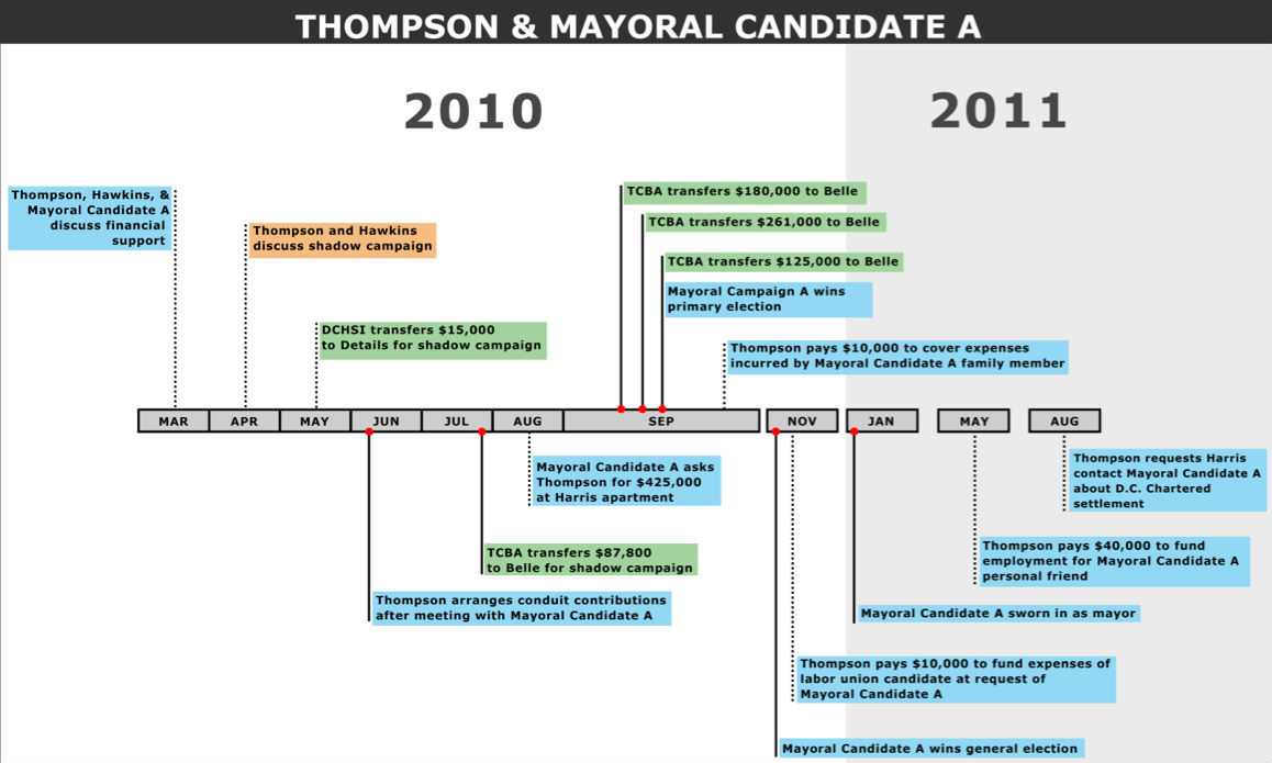 According to the government, Thompson conducted shadow campaigns for one other mayoral candidate, six Council candidates and national candidates, who Machen said had “varying degrees of knowledge” about what was happening. There’s no indication the presidential candidate, believed to be Hillary Clinton, “was personally aware of Mr. Thompson’s illicit activities,” Machen said. None have been charged.