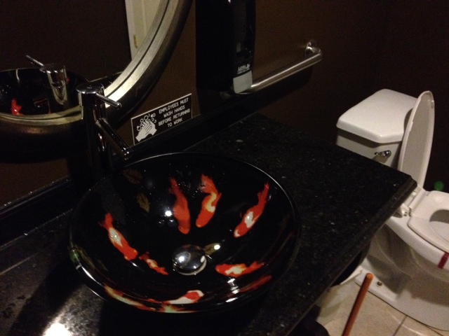 +5 for a fancy sink: The most striking thing about Bravo’s bathroom is its gorgeous onyx porcelain sink. Not only does it dominate the room, it also has several cartoon-y peppers koi fish on the bowl. This is sort of sink you’d find at a bougie mojito bar in Dupont Circle or something (the soap dispenser is nowhere near as aesthetically pleasing). I, for one, like to feel all fancy before I get back to my questionable snack and drink options.