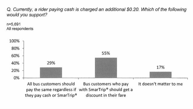 In July, the price of a bus ride will increase from $1.60 to $1.75 for people who use SmarTrip. For people who use cash, the trip will actually become cheaper, falling from $1.80 to $1.75. In an online survey conducted during the budget process, the majority of riders said SmarTrip users should receive a discount on the bus. Metro says that SmarTrip is used for more than 90 percent of bus trips.