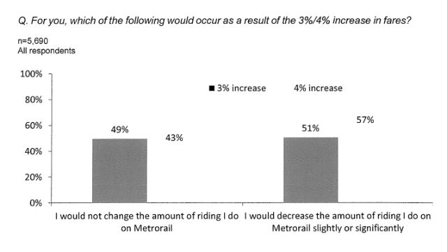 Rail riders will see a 3 percent increase in fares, which will add about $.10 to a typical trip. Fifty-one percent of respondents to Metro’s survey said this will cause them to decrease their rail use “slightly or significantly.”