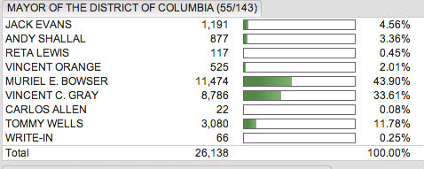 10:34 p.m.: More results are in from DCBOE. With 55 of 143 precincts counted, Bowser leads Gray by about 10 percent.