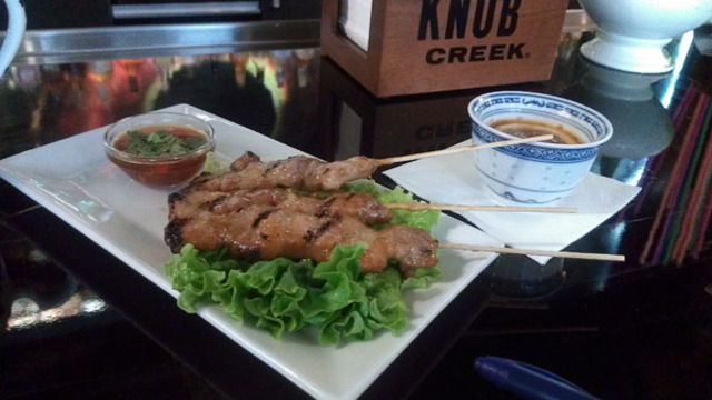 So what exactly is Thai street food? During a pre-opening media tour, DCist did the hard work of sampling a number of dishes and drinks for the edification of our dear readers. Owners Nat Ongsangkoon and Dia Khanthongthip wanted to develop a menu that reflected the food they ate at home, instead of the same dishes that grace the menu at practically every Thai restaurant. As a result, prospective diners will recognize some familiar names, but there will also be many new dishes for adventurous fans of Thai cuisine. Some examples: Succulent coconut milk-marinated pork belly skewers with in-house made lime chili sauce; juicy chicken folded into fragrant pandan leaves; and pad thai hor kai, a variant of pad thai swaddled in a tender egg crepe. Whole fried chicken featuring an airy, crackling crust and umami-packed dipping sauce was a particular standout. Chef Mitchai Pankham, who hails from northern Thailand, has other intriguing items planned, including ped roti (roasted duck wrapped in roti bread) and kor moo yang (grilled pork neck with lime and chili). Dishes will run $10-18 during lunch and $14-25 at dinner.