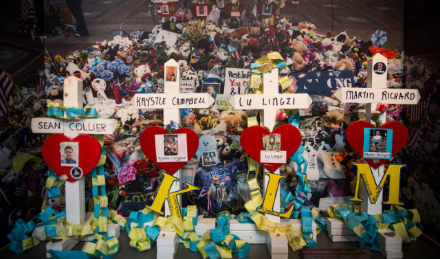 Crosses bearing the names of people killed are displayed in an exhibit titled, ‘Dear Boston: Messages from the Marathon Memorial’ in the Boston Public Library. (Photo by Andrew Burton/Getty Images)