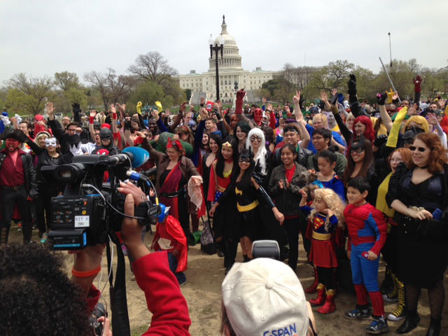 Today that scene could’ve happened in real life had things gone south in front of the Capitol Reflecting Pool, where more than 200 comic book cosplayers gathered in an attempt to break a world record. Luckily, everyone was very friendly with each other and happy to be there, despite the many superhero rivalries represented.