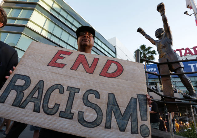 Dexter McLeod holds a sign protesting racist comments made by L.A. Clippers owner Donald Sterling outside Staples Center before a playoff game. (Photo by Jonathan Alcorn/Getty Images)