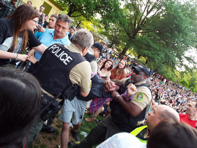 According to an eye witness, Jonny Grave, the incident occurred during the band’s song, when a “young man stood up in front of the seated crowd to watch.” Police reportedly asked him several times to sit down, but he refused. “When the young man refused to sit down, another officer moved in,” Grave says. “Then another. And then another.”