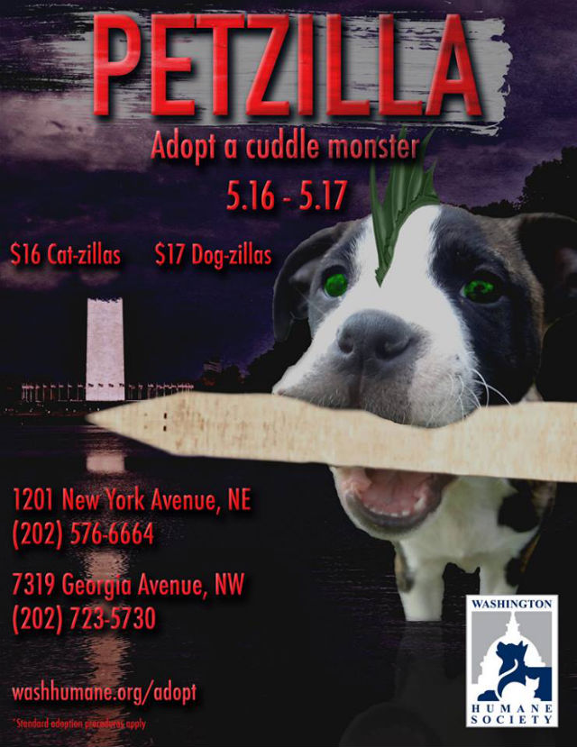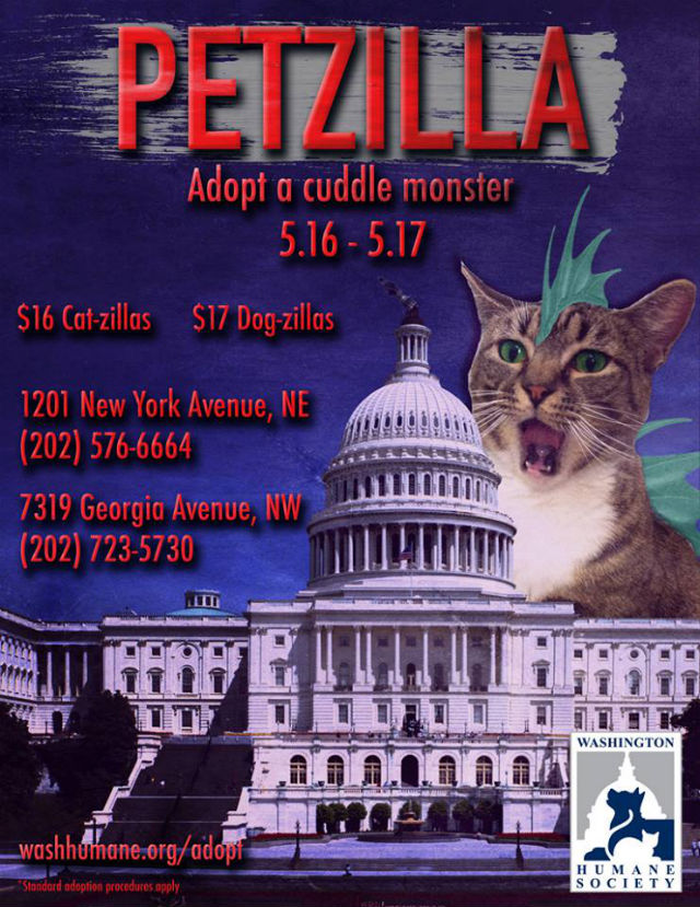 This Friday and Saturday, cats and dogs will be adopted for $16 and $17, respectively, at both the New York and Georgia Avenue shelters. The promotion this time? “Petzilla.”