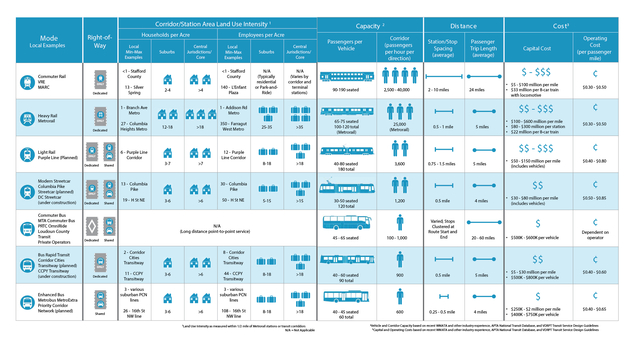 Here’s a graphic, which you’ll want to open in a new tab, that compares Metrorail to other high capacity transit modes in the D.C. area.