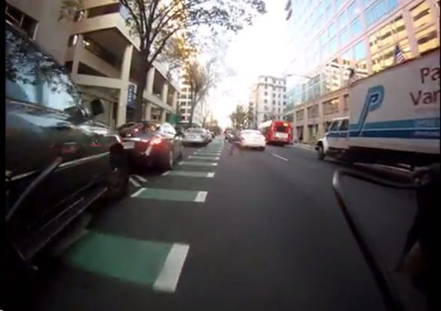 A view of illegal activity in the L St NW cycletrack from Evan Wilder’s handlebar-mounted video camera.In 2011, Evan Wilder was hit by the driver of a truck after he was told to “move his genius ass to the fucking right” while riding in the center lane on Rhode Island Avenue NE. We know this because Wilder was filming his ride.