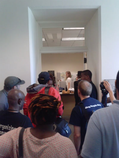 People in attendance broke into groups — adult education, housing, youth issues, etc. — to visit each Councilmember’s office. The housing group first visited the office of Councilmember Muriel Bowser, who was not in. Two members of Bowser’s Legislative Counsel listened and took notes as people directly affected by the lack of funding spoke.
