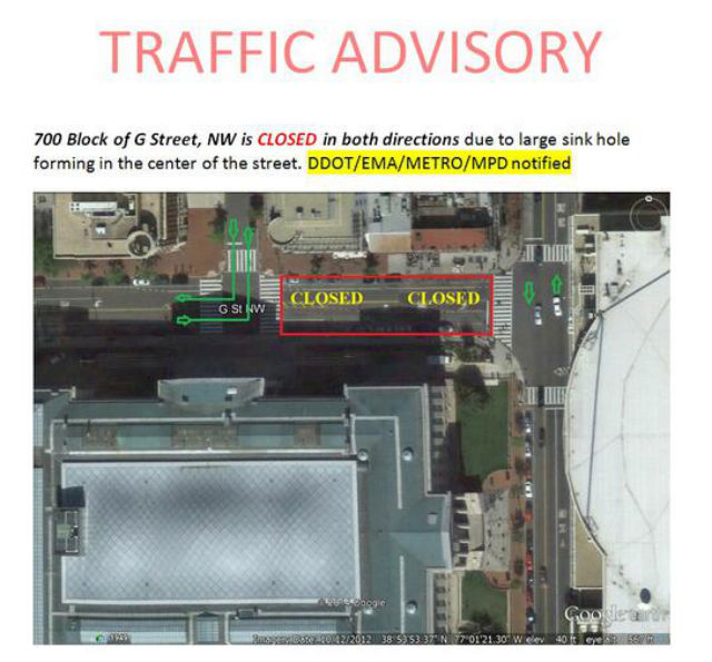 A new version of everyone’s favorite D.C. celebrity — a sinkhole — has opened up in downtown D.C. Fox 5’s Matt Ackland reports that the hole, which has closed the 700 block of G Street NW, is 18 by 18 inches feet and has been reported to the Department of Public Works to fill. Will it be around long enough to inspire a cocktail special? Stay tuned.