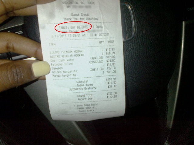 Earlier today, Lambda Legal—an LGBTQ civil rights organization—filed a complaint with the D.C. Office of Human Rights. The complaint alleged that Amira Gray—a transgender woman—went to Bistro 18 on August 11, 2013 with eight of her friends and, when they received the check, the words “GAY BITCHES” was printed where the customer’s name would go.