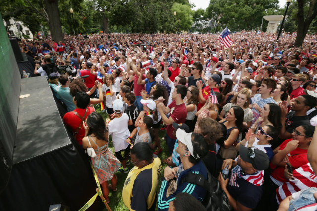 Since ESPN started broadcasting World Cup matches, D.C. has consistently been the highest-rated market. For today’s big match, the German Embassy hosted a free viewing party in Dupont Circle, with the match broadcasted on several large screens. And, with a note from the U.S.’s coach excusing them from work, thousands gathered in Dupont to watch the big game: