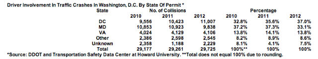 In 2012, there were 29,725 collisions reported to the Metropolitan Police Department in D.C. Of those incidents, D.C. drivers were involved in 11,007, or 37 percent. They’re followed by Maryland drivers (9,838/33.1 percent) and Virginia drivers (4,106/14.1 percent). Other came in at 8.6 percent and unknown at 7.5 percent.