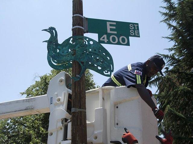 Capitol Hill street signs have gone to a dog — and an emu, a spider, and a falcarius.