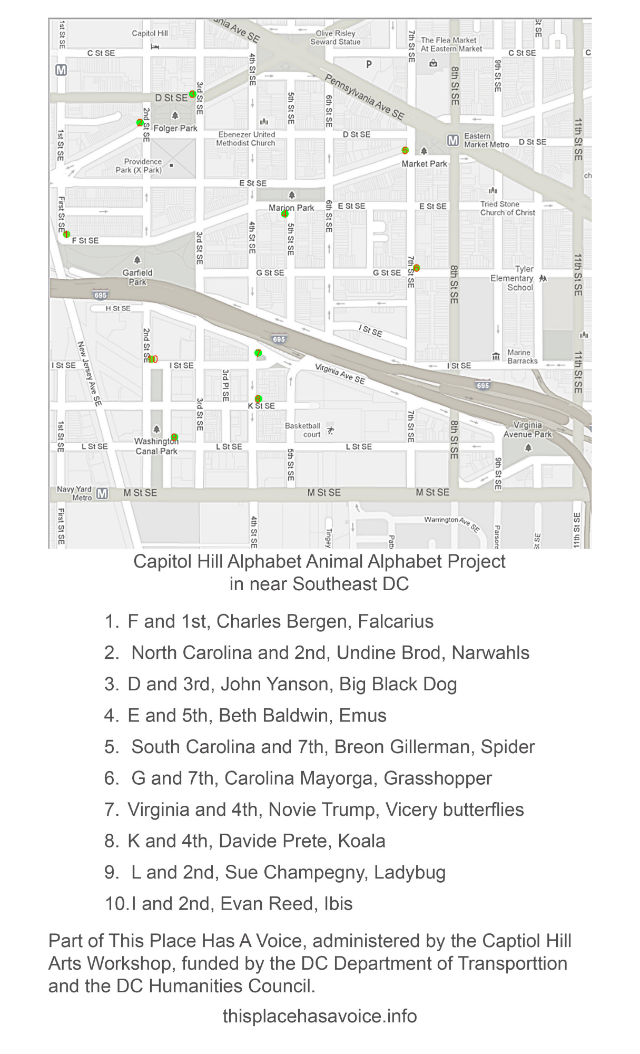 As part of the This Place Has A Voice project, the Capitol Hill Arts Workshop commissioned ten sculptures in that Southeast D.C. neighborhood for the Capitol Hill Alphabet Animal Art Project. As its name implies, the project — which was funded by the D.C. Department of Transportation, the DC Humanities Council and the DC Commission on Arts and Humanities — brings sculptures of animals to streets that share a first letter. Artists worked with local historian Mara Cherkasky. Activities surrounding the project will be announced soon.