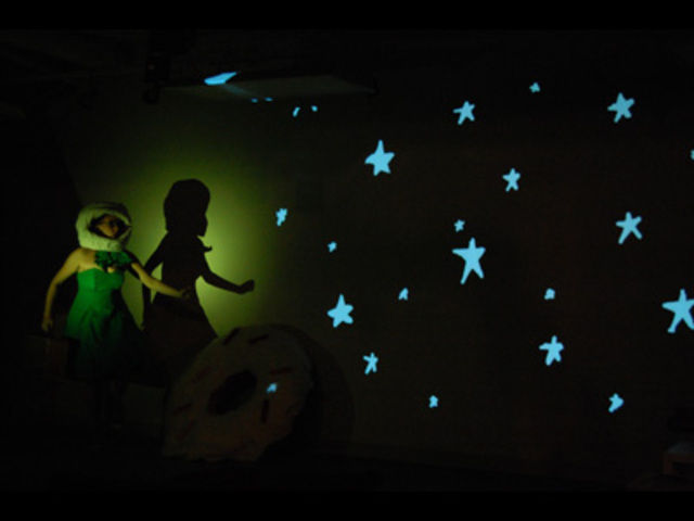 The pear in space! Photo by Jen Neads of No. 11 Productions.Coosje (pronounced KOH-shuh), by New York’s No. 11 Productions, is a poignant, irreverent, whimsical musical that portrays the love story of artists Claes Oldenburg and Coosje Van Bruggen. The artist couple is best known for their large sculptures of everyday objects, including Typewriter Eraser, on view in the National Gallery of Art Sculpture Garden. The style of the play pays homage to Oldenburg’s zany, nonsensical nature, beginning with a black and white video of a “happening.” Before the video, the actor portraying Claes states, “If you don’t get it, you’re onto something,” which is good since there is no sense to be made of hat-wearing, bespectacled, goofy actors running around a corn field with swords and typewriters.