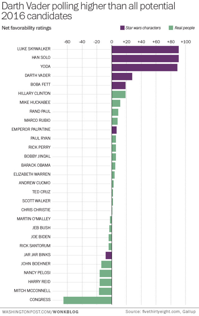 The folks over at the Post’s Wonkblog took the numbers released from a recent poll conducted by FiveThirtyEight about American’s favorite Star Wars character and compared them with the favorability of presidential hopefuls for the 2016 election and put it all into one chart graphing the net favorability ratings. The results find that a majority of Americans would favor Luke Skywalker over any actual presidential hopefuls. Tied with him is Han Solo, followed by Yoda. In fact, even Star Wars villains like Darth Vader and Boba Fett poll higher than any actual real politician. Of the real people, Hilary Clinton has a sizable lead over Mike Huckabee and Rand Paul.