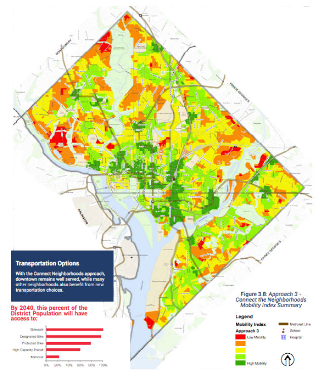 During the planning portion of MoveDC, three approaches were presented to the public, with stay the course the most basic. Under the most aggressive approach, 100 percent of District residents would have access to sidewalks by 2040 and nearly 100 percent to a designated bike lane.