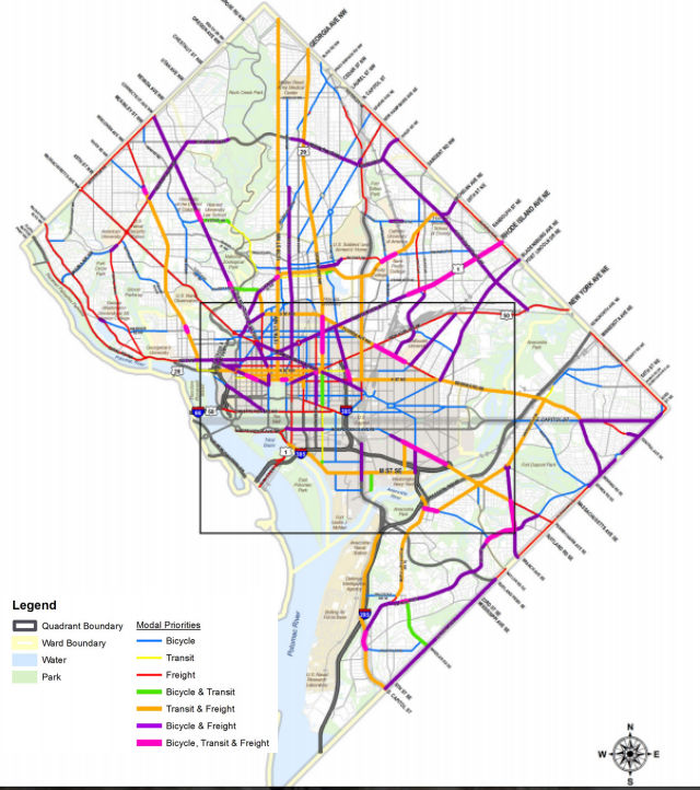 That approach was most popular with people who attend DDOT’s public meetings and influenced what made it into the final MoveDC plan. Here, for example, are the modal priorities from MoveDC.
