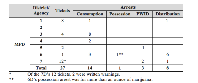 According to data from the MPD, between July 17 and July 31, 26 people have been arrested for marijuana-related crimes that don’t fall under the new decriminalization law. While the original bill, proposed by Councilmember Tommy Wells, included a measure that would decriminalize the consumption of marijuana in public—punishable by a $100 fine—it was ultimately scrubbed after some back-and-forth between Councilmembers. As a result, 14 people have been arrested for marijuana consumption since the law went into effect. Additionally, only one person has been arrested for possession of amounts greater than an ounce, while three have been arrested for possession with intent to distribute, and eight have been arrested for distribution.