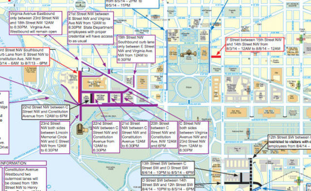 Constitution Avenue both directions between 17th Street NW and 23rd Street NW from 12 p.m. to 2:30 p.m. Traffic southbound from 18th/19th Street will be allowed to flow eastbound on Constitution Avenue NW during this time
