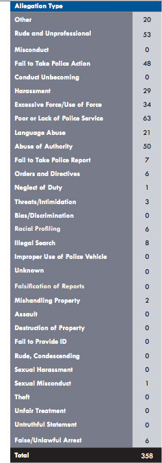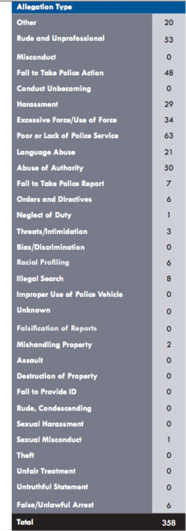 Most of the alleged misconduct involved poor or lack of police service (63 cases), while 53 cases alleged officers were rude or unprofessional and 50 alleged abuse of authority.