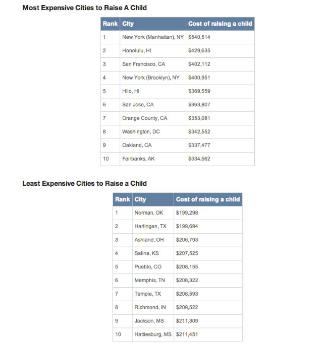 To find these numbers, NerdWallet adjusted the $245,340 determined by the USDA for the cost of living in each city using the cost of living index from the Council for Community and Economic Research. To no one’s surprise, the most expensive place to raise a kid born last year is New York—Manhattan, specifically—where it cost about $540,514. In D.C., that number is significantly lower—$342,552—but still damn high. The other most expensive cities include Honolulu, San Francisco, Brooklyn (in New York), Hilo, Hawaii, San Jose, and Orange County.