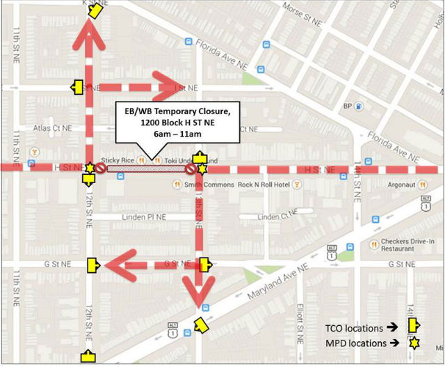 The closure will take place from 6 a.m. to 11 a.m. Sunday in the 1200 block of H Street so the D.C. Department of Transportation can “test operational coordination and preparedness of DC Streetcar and first responder personnel in the event of an incident involving a streetcar.”