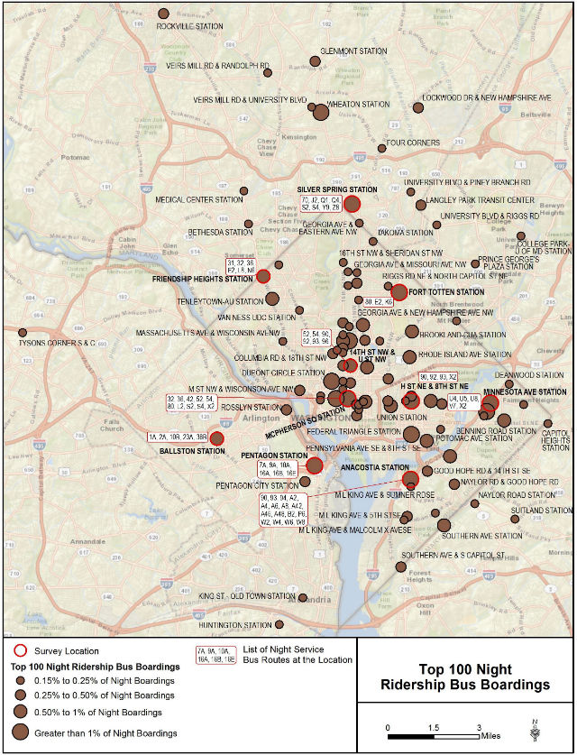 As the the agency’s PlanItMetro blog reports, Metro looked at where current late-night boardings happen to begin the process. Below is a map showing the 100 stops where people board buses between 11 p.m. and 4 a.m. the most. Note that many of the most happening late-night stops are at Metrorail stations.