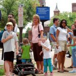 A tourist family is walking by.