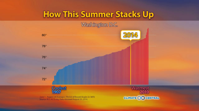 It was the latter kind of year in D.C., or at least that’s the way it felt. As a graphic prepared by Climate Central shows, this summer was on the warmer end of historical records. They note:
