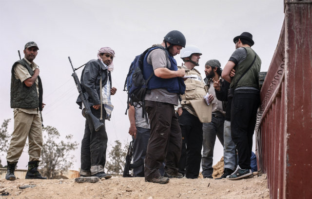 American journalist Steven Sotloff, center with black helmet, talks to Libyan rebels on the Al Dafniya front line in 2011. (Photo by Etienne de Malglaive via Getty Images)