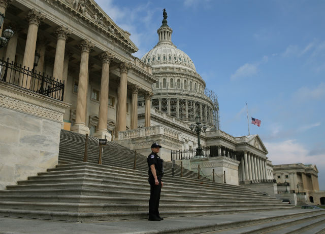 A U.S. Capitol Police officer stands guard in front of the Capitol building as the American flag flies at half staff. (Photo by Mark Wilson/Getty Images)
