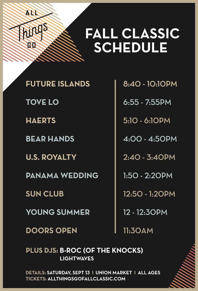 The first annual Fall Classic—a new music festival organized by local music website All Things Go—is tomorrow at Dock 5 behind Union Market. Buzzy indie/electropop trio Future Islands headlines the gig, and a smattering of local and national pop bands—including Tove Lo, Haerts, U.S. Royalty, and more—will perform from noon to 10 p.m. We’ve got a peak of the schedule for your viewing pleasure right here: